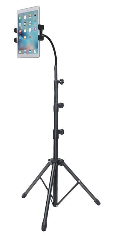 Univerzální teleskopický stojan pro tablety a obrazovky o velikosti 4,5"-12,9" (12-33cm).Šířka otvoru držáku 13,5-22cm, nastavitelná výška stojanu 0,55-1,65m, otáčení o 360°, husí krk umožňuje nastavit libovolnou polohu. Balení obsahuje úložnou sáček a skládá se ze 2 nástavců, 1 flexibilního prvku, 1 stativu a 1 nastavitelné silikonové svorky, aby nedošlo k poškození obrazovky ak zabránění jejímu posouvání.